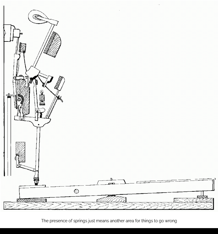 Springs succumb to wear and tear over time, thus leading to unevenness from one note to the next throughout the keyboard. Moreover, in order to repeat a note on an upright, the key must be allowed to come all the way back to the top of the stroke before it can be played again. In a grand, a note can be repeated after the key has come up about a third of the way to the top. This means that a grand’s action gives the player more control. There is also thus a greater limit to the number of times the same note can be played per unit time when a grand is used.