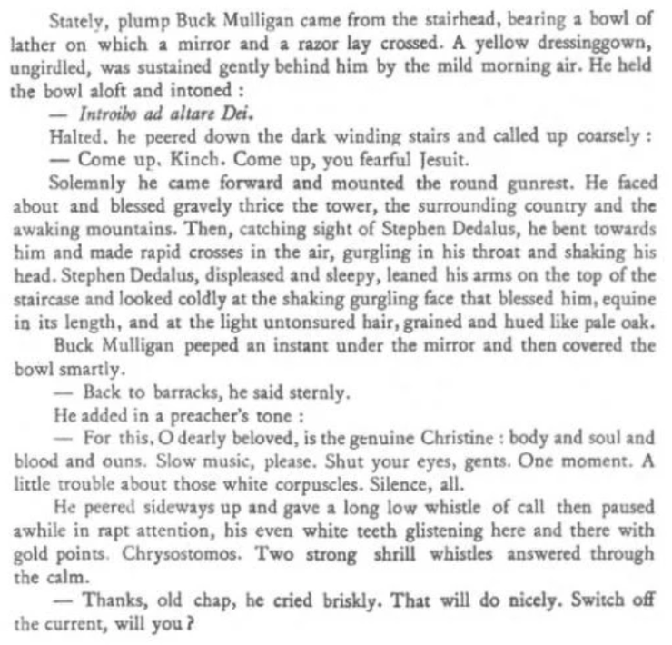 Consider that first sentence once again: “Stately, plump Buck Mulligan came from the stairhead, bearing a bowl of lather on which a mirror and a razor lay crossed”. By the way, this first sentence in Ulysses is rated by The Guardian the top 10 best first lines in fiction. A stairhead is a level space at the top of a flight of steps. Buck Mulligan, in mockery of the Catholic ceremony of the Tridentine Mass, has just ascended the steps in imitation of a Roman Catholic priest ascending the steps to the altar.