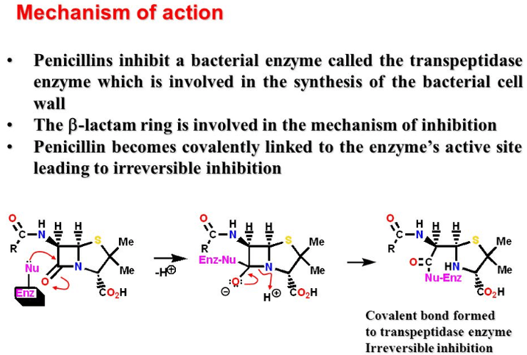 Penicillin works by binding to penicillin-binding proteins, which ultimately leads to cytolysis. One such protein is transpeptidase, the enzyme which catalyses the pentaglycine cross-links that connect the amino group on one N-Acetylmuramic acid to the amino group on another N-Acetylmuramic acid. When penicillin binds to transpeptidase, penicillin inhibits transpeptidase.