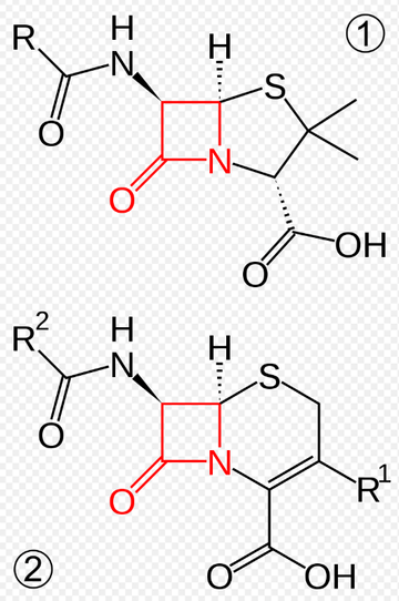 In the above image, we have the core structures of penicillin above (1), and the cephalosporins below (2). The part highlighted in red is known as the beta-lactam ring. It is named as such because a lactam is a cyclic amide (which is evident from C=O and the C-N bonds within the red 4-membered ring), and it is a beta-lactam because if the peptide bond were hydrolysed, then the nitrogen atom would be attached to the beta-carbon. The takeaway is that both penicillins and cephalosporins both belong to a broader category of antibiotics known as beta-lactams.