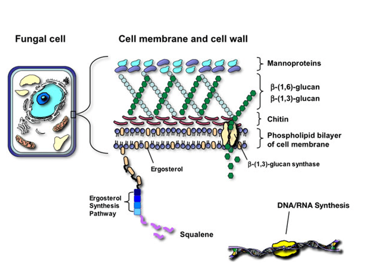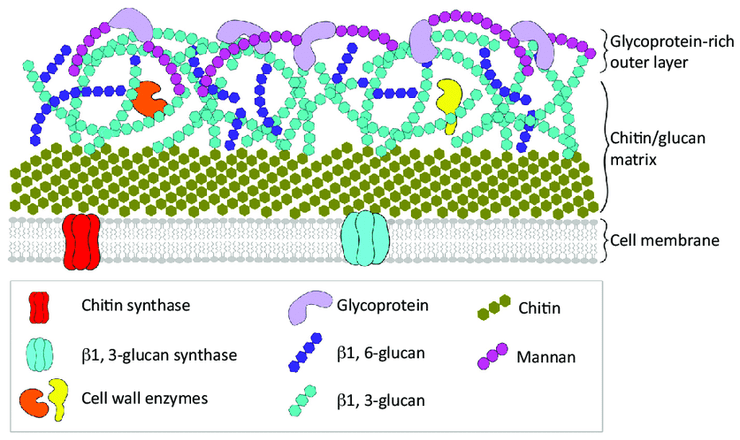 For the sake of our discussion, let us ignore plants and non-infectious agents since I am interested in infectious agents. For eukaryotic infectious agents, we have fungi, protozoa, helminths, and ectoparasites. Of these eukaryotic infectious agents, only fungi have cell walls. As for prokaryotes, we basically only have bacteria, and most bacteria have cell walls. Here is a diagram showing the structure of a fungi cell wall.