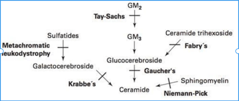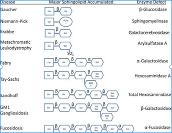 And the above is only for the diseases implicating sphingolipids (i.e. sphingolipidoses). Another category of lysosomal storage diseases would be the mucopolysaccharidoses, the most prominent of which are Hurler’s syndrome and Hunter’s syndrome. Only metachromatic leukodystrophy isn’t an eponym! Here is another useful image I found that shows you how deficiencies of various enzymes in sphingolipid metabolism result in the accumulation of various sphingolipid derivatives: