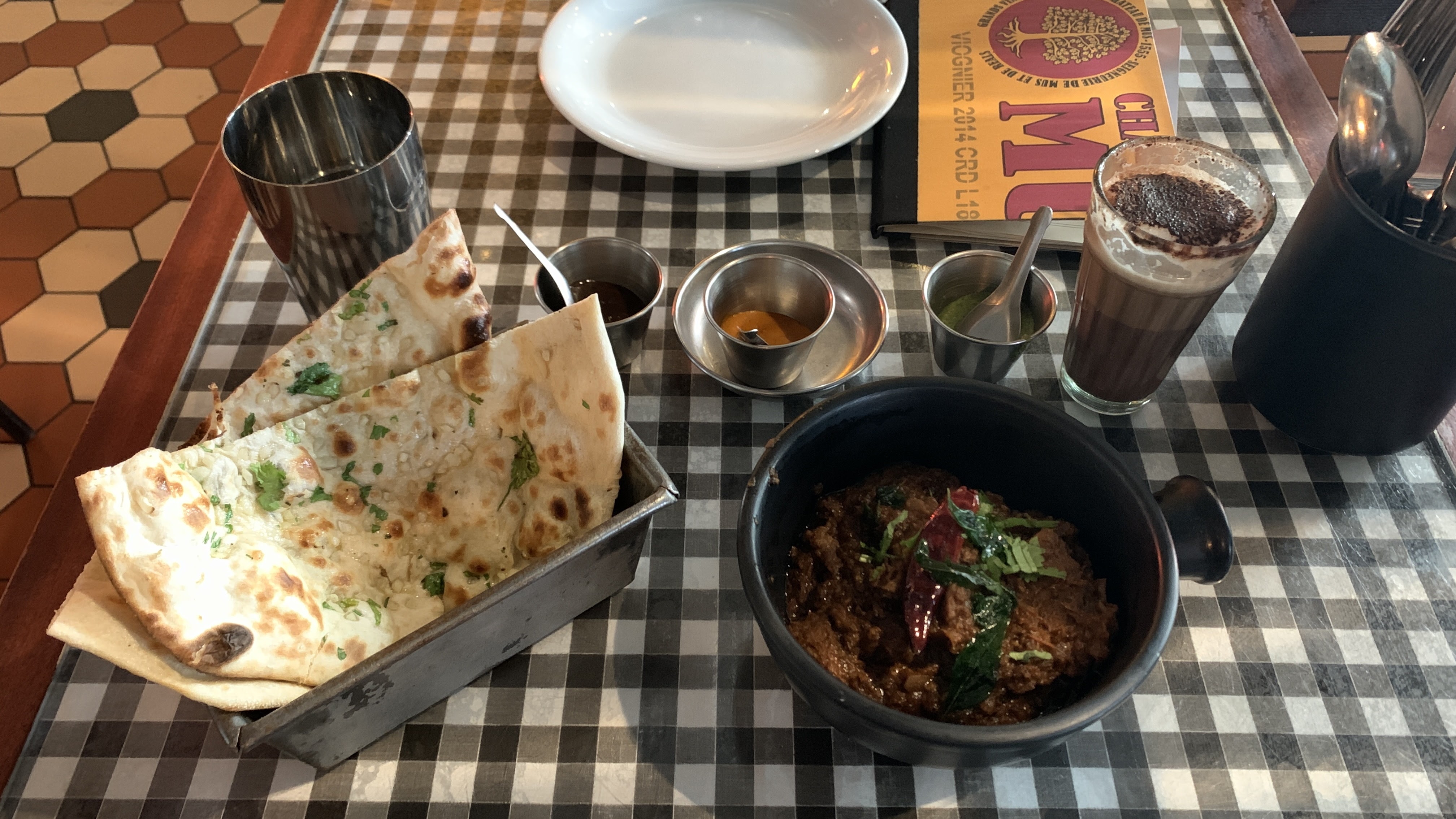 When I reached the correct Travelodge, it was still too early for checking into my room (the standard check-in time was 3 pm). So, I decided to deposit my luggage with the counter and headed off for lunch at Dishoom Shoreditch, which had been recommended by someone who had been to London and enjoyed the food there. At Dishoom, I ordered the Garlic Naan + Mutton Pepper Fry (which came with three types of spices as seen in the saucers in the image below) + Chocolate Chai (which to my pleasant surprise, is refillable).