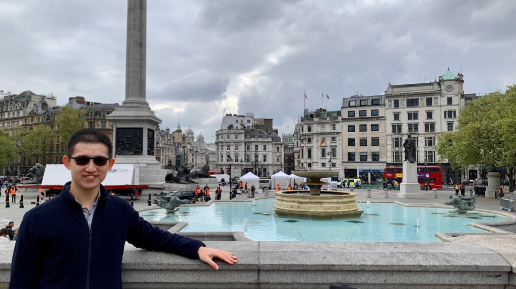 This is a photograph of me and Nelson’s column in the background. Constructed in the 1840s, the column is a monument in Trafalgar Square to commemorate Admiral Horatio Nelson, who died at the Battle of Trafalgar in 1805.