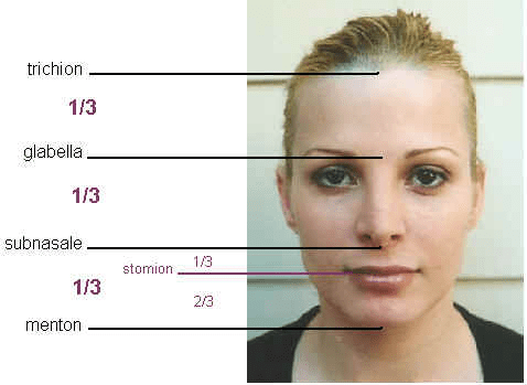 As for the nose, it should not be too wide. Ideally, the beautiful nose is approximately a fifth of the width of the face. The following image illustrates the proportions in a female face, but the same ratios apply to men as well. In addition to the width ratios, the partitioning of the face in three different vertical segments of equal length is notable too. The distance from the trichion (the point on the skin which coincides with the intersection of the sagittal plane and the normal anterior hairline) to the glabella should be equal to the distance from the glabella to the subnasale (the point on the facial skin which represents the most inferior part of the nose), which in turn should be equal to the distance between the subnasale and the menton (the most inferior point in the sagittal plane of the chin). A picture tells a thousand words, so review the following images if you didn’t quite get what I just said!