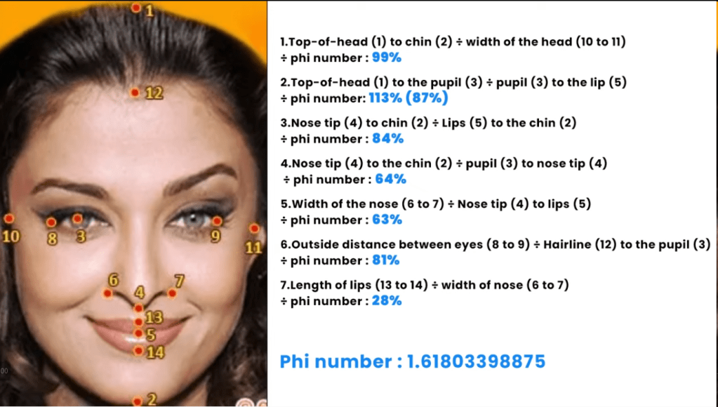 For example, the ratio of the length to the width of your face should correspond to the golden ratio (= (1+sqrt5)/2 = 1.618…) for maximal attractiveness. For even more calculations regarding the golden ratio, consider the following image as a guide. For a particular face you select, plug the raw values into the provided formulae and churn out the answers (expressed as a percentage). A score as close to 100% as possible would suggest higher attractiveness.