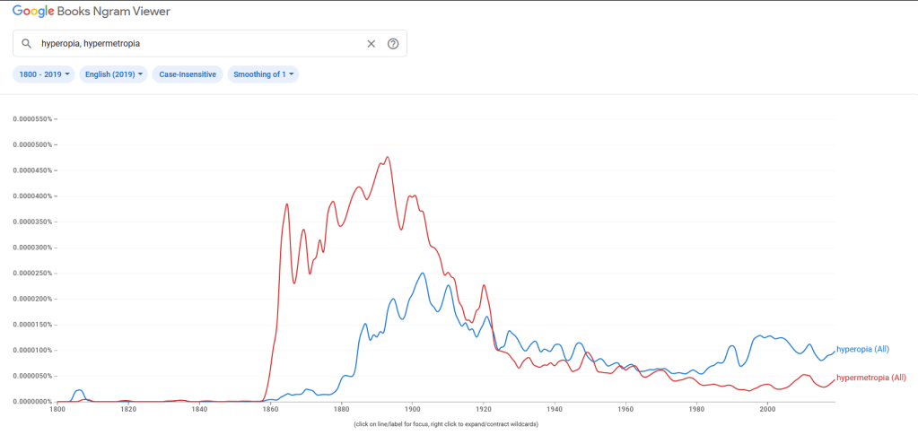 Despite Duke-Elder’s criticisms, it seems that both terms have persisted in the ophthalmic community, with ‘hyperopia’ seemingly being the more popular one (at least based on Google’s Ngram viewer (see below), which reports that ‘hyperopia’ has been consistently the more popular of the two terms since the 1970s). This could be because it’s a shorter word.